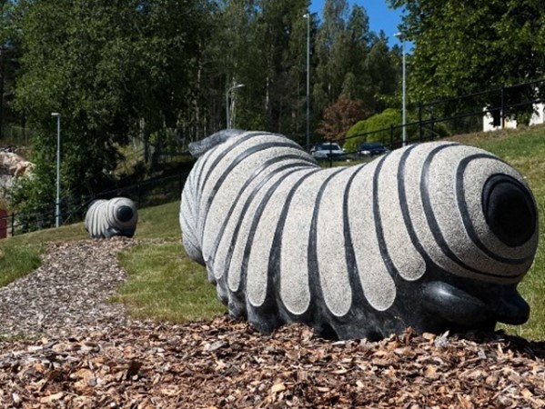 Två granitskulpterade larver rör sig över gräset, som om de krupit fram ur marken. En bit därifrån vilar en fjäril med utspända vingar på en sten, högt upp på kullen med utsikt över sjukhusområdet.
