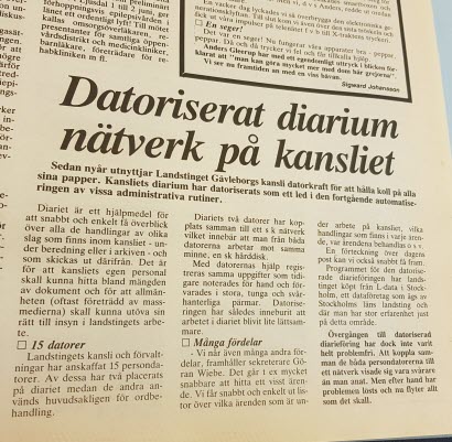 Månadens fotografi föreställer en artikel i landstingets personaltidning X-trakten från 1987. Journalisten låter informera alla landstingets medarbetare om att från och med nyår "utnyttjar Landstinget Gävleborg datorkraft för att hålla koll på sina papper"! Två datorer hade kopplats samman "till ett så kallat nätverk" vilket enligt uppgift gjorde arbetet i diariet lite lättsammare. Tur var väl kanske det för åtta år senare gick den administrativa personalen ut i strejk och en artikel i Gefle dagblad från 11 oktober 1995 bär rubriken: "Politiker tar över diariet".