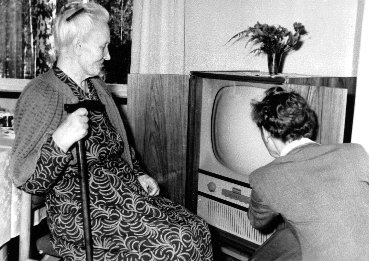 Den 24-tum stora TV-apparaten var en gåva från den Socialdemokratiska Kvinnoklubben i Sandviken, och TV-antenn och montering skänktes av Ragnas Ansells firma. Från landstingets sida fanns regler som preciserade att kronikerhem endast fick ha TV-apparater i dagutrymmen så vi kan anta att det är ett sådant vi ser här. Det är husmodern Anne-Marie Eriksson som, tillsammans med en patient, tar emot TV-apparaten.