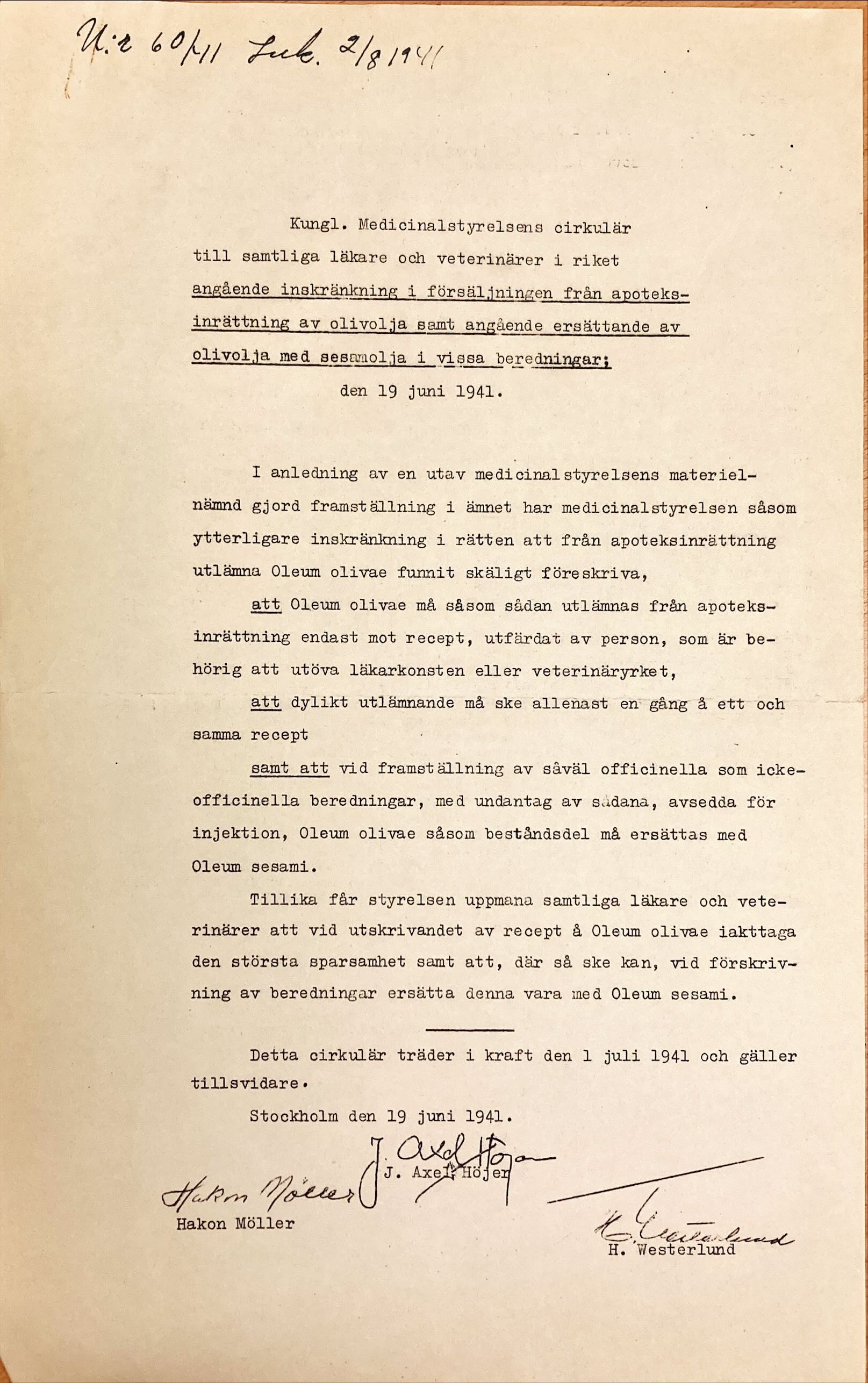 Cirkulär från Kungliga Medicinalstyrelsen som 1941 inkommit till provinsialläkare Synnergren i Alfta. Foto: Regionarkivet
