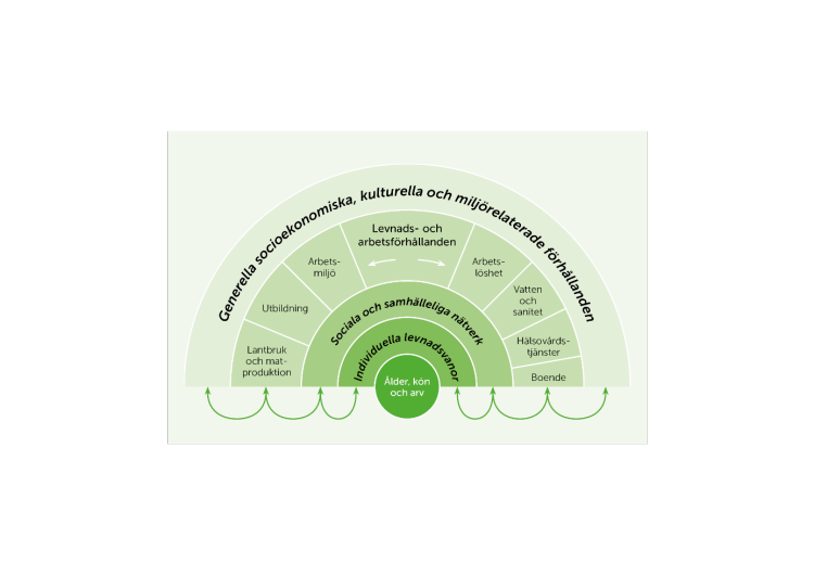Med förutsättningar för hälsa, menar vi det stora antal faktorer (allt från genetik till levnadsvanor och händelser i omvärlden) som påverkar hur vi mår. Ofta illustreras de i en solfjäder-illustration lik den här.