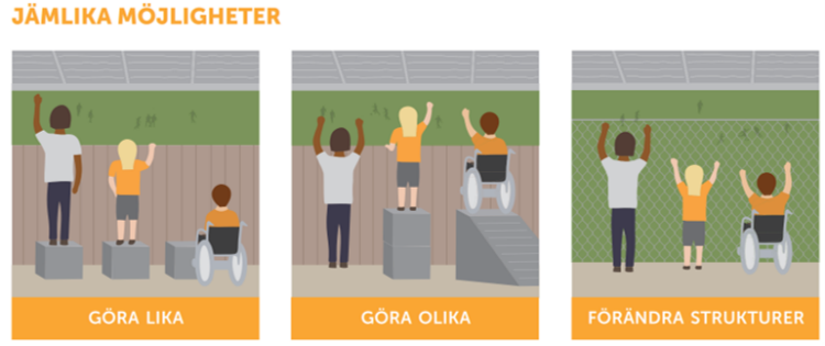 För att skapa likvärdiga möjligheter för fler är det viktigt att uppmärksamma människors olika förutsättningar och behov och utifrån det anpassa det vi erbjuder och det vi begär av dem så att möjligheterna öppnar sig för fler. Det betyder att vi inte kan göra lika för alla, utan att vi behöver göra olika utifrån olika behov, eller att vi behöver förändra våra strukturer så de passar fler.