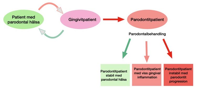 Klicka på länk till flödesbild ovan: Övergången från parodontal hälsa till gingivit är reversibel (kan gå i omvänd riktning) efter behandling som resulterar i gingival inflammationsfrihet. Vid övergång till parodontit sker fästeförlust som är irreversibel (ej går tillbaka).