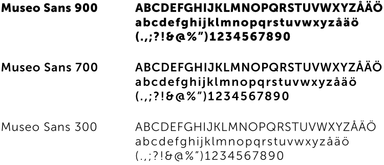 Som profiltypsnitt använder vi Museo Sans. Typsnittet finns i vår logotyp och skapar igenkänning i vår kommunikation. Typsnittet har bra läsbarhet både på skärm och i tryck  och används därför vid produktion av såväl webb och digitala applikationer som till trycksaker, annonser, skyltar, utställningsmaterial och profilprodukter. Museo Sans sätts i både rubriker, ingresser, brödtext och faktarutor.