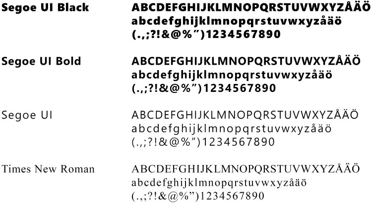 I Region Gävleborgs kontorsmallar för texthantering (exempelvis Word och Powerpoint) använder vi typsnitten Segoe UI och Times New Roman. Båda typsnitten har bra läsbarhet och finns tillgängliga i alla medarbetares datorer.